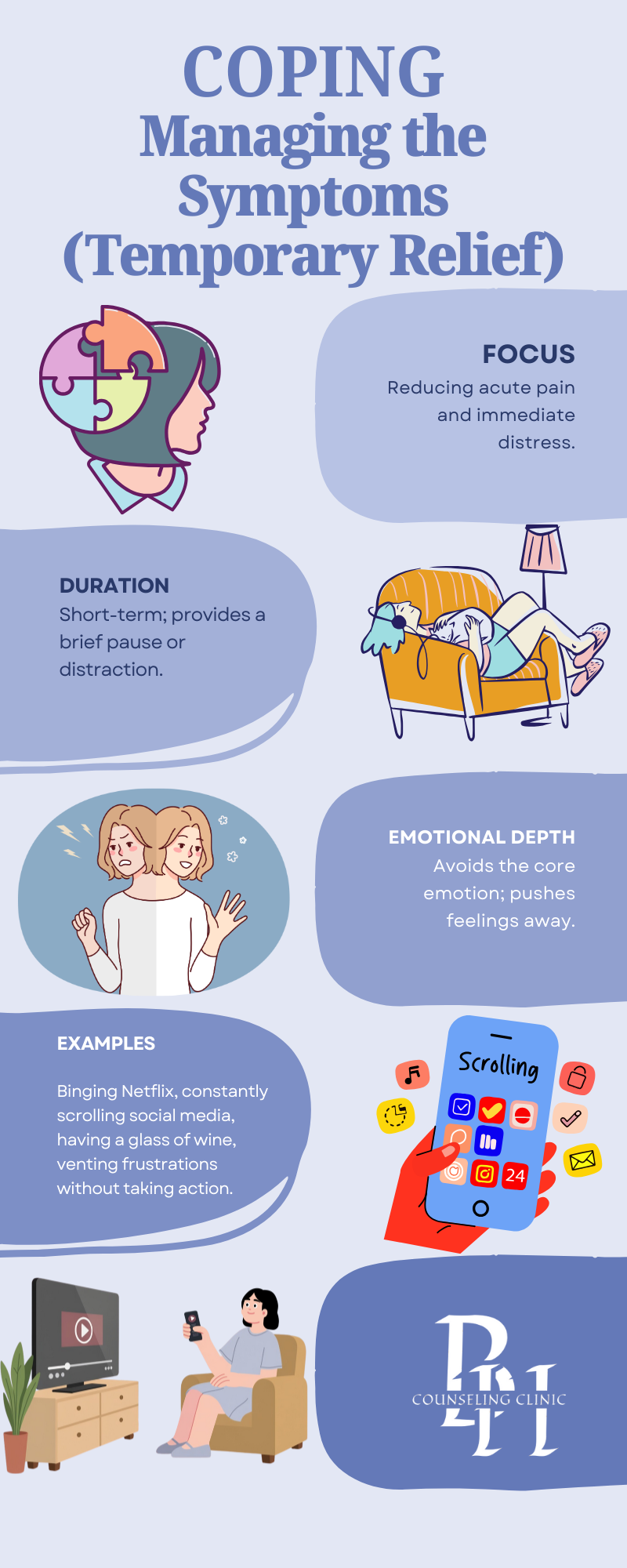 The Counselor's Perspective: Coping is necessary for survival. You cannot process trauma while in a panic attack. We teach healthy coping skills (like deep breathing or Vagus Nerve stimulation) to buy you time. However, if coping becomes your only strategy, you never address the root cause, leading to chronic anxiety and exhaustion.